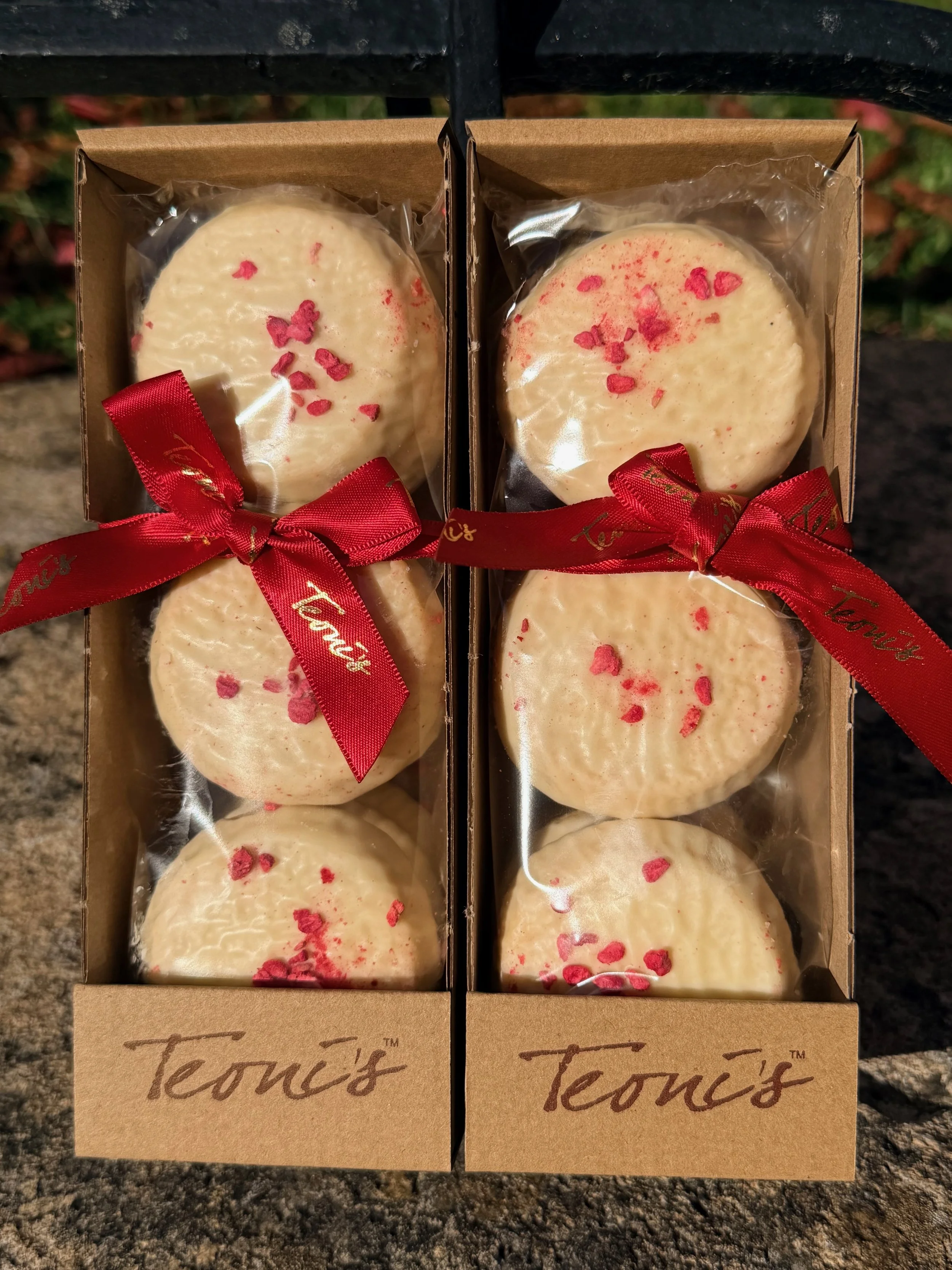 These delicious white chocolate covered biscuits with freeze dried raspberrys have been tried and tested! They make a lovely gift.